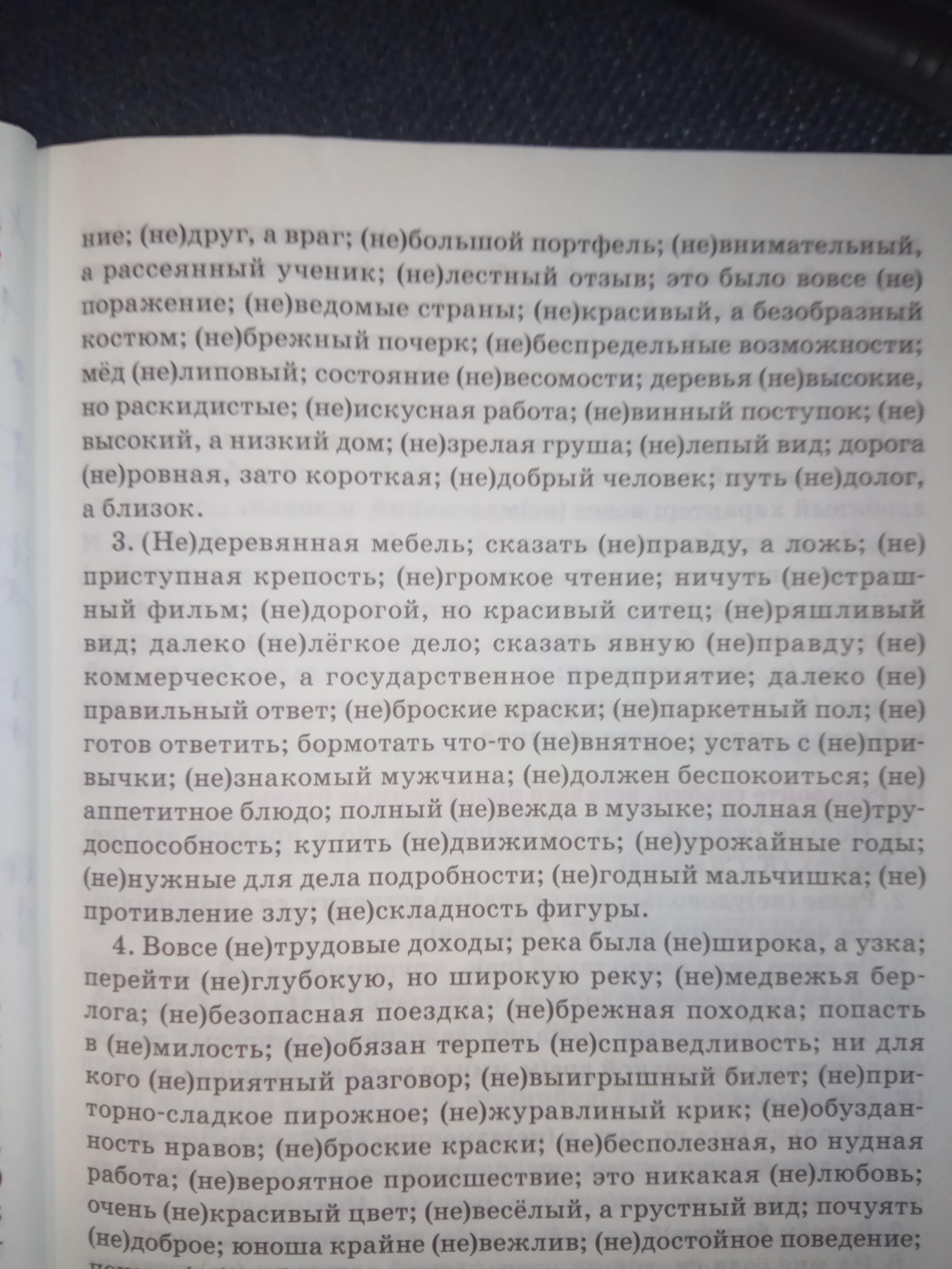 Нелестный, не поражение;неведомые страны; не красиаый; небрежный; не беспредельные возможности; мед не липовый, состояние невесомости; не высокие____,а раскидистые, неискусная, невинный поступок, не аысокий дом, незрелая груша, нелепый вид, не ровная дорога, зато, недобрый человек, путь не долог,а близок
