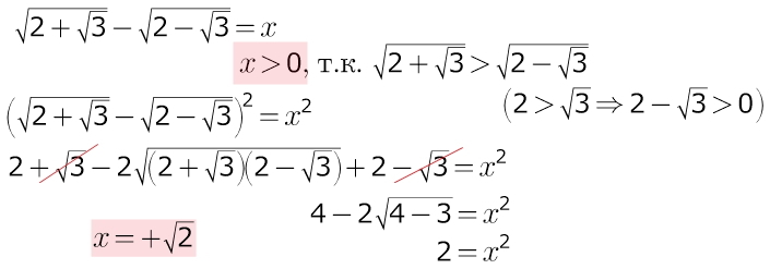 х²=2+√3-2*√((2+√3)(2-√3))+2-√3