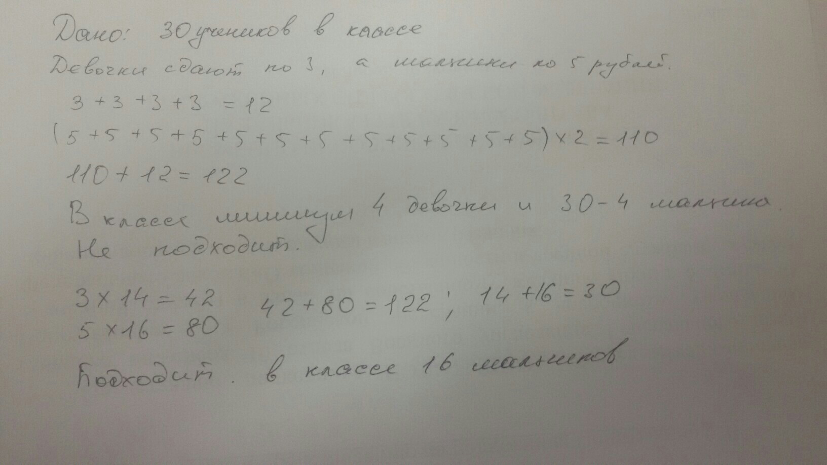 вася посчитал что если каждая девочка принесет по 3 руб. каждый мальчик по 5 об этом все 30 учащихся класса заберут 122 руб сколько в классе мальчиков