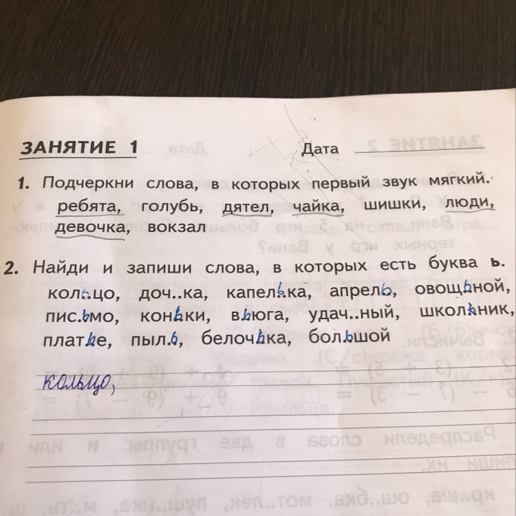 Слова с «ь» знаком: кольцо, капелька, апрель, письмо, коньки, вьюга, школьник, платье, пыль, большой.