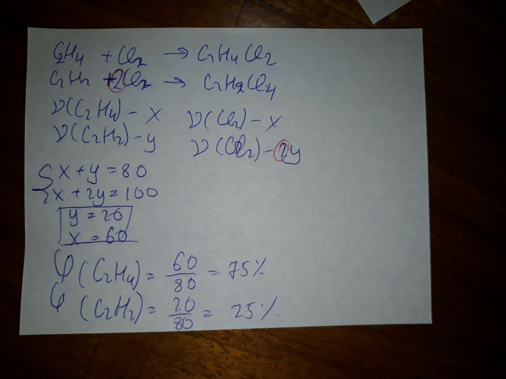 Смесь этена и этина объемом (н.у.) 80 см3 присоединяет хлор объемом (н.у.) 100 см3. Найдите объемные доли газов в исходной смеси, если известно, что конечная смесь не обесцвечивает бромную воду.