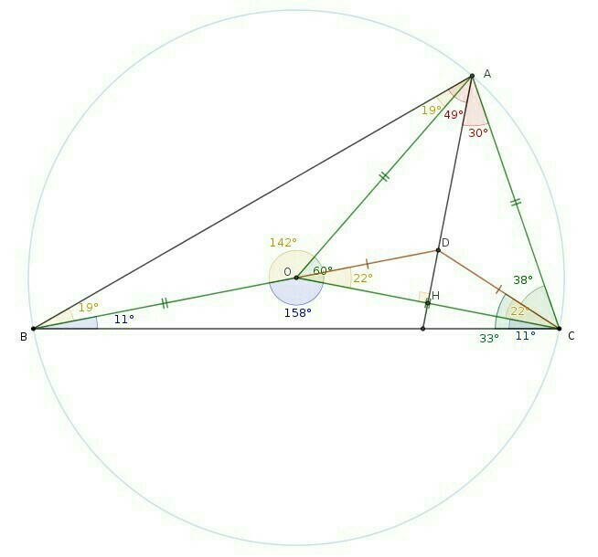 угол ОВС = угол ОСВ = ( 180° - 158° ) : 2 = 22° : 2 = 11°