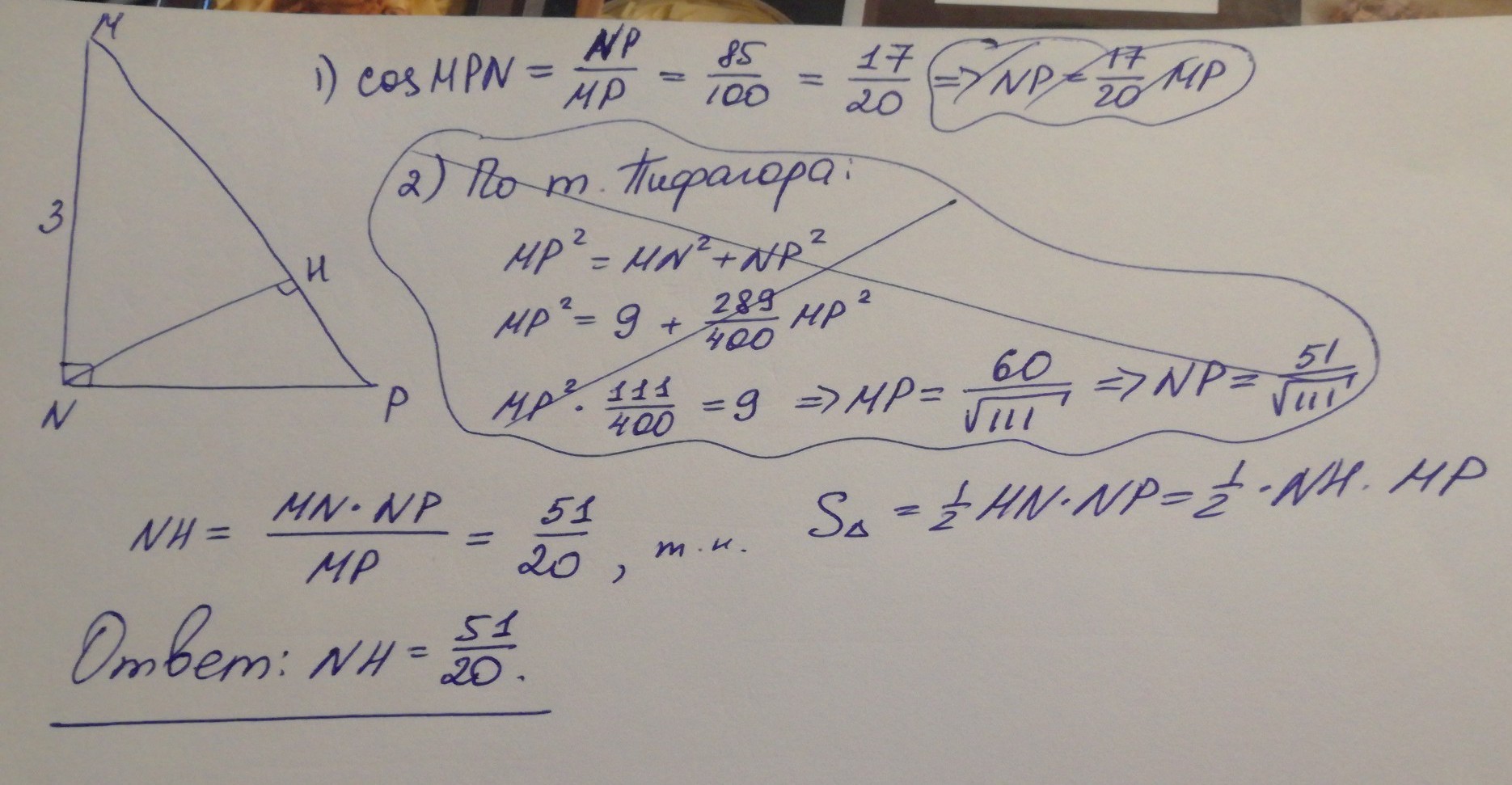Из угла N опущена высота NH на гипотенузу MP. COS угла MPN=0,85