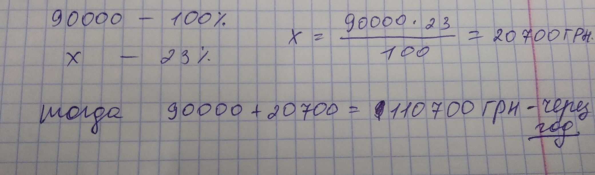 человек взял кредит в размере 90000 грн под 23% годовых. сколько денег он должен вернуть через год?