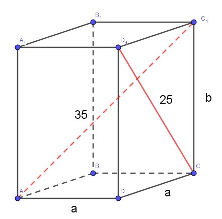 диагональ правильной четырехугольной призмы равна 35 дц, а диагональ боковой грани равна 25 дц. вычислите объем призмы