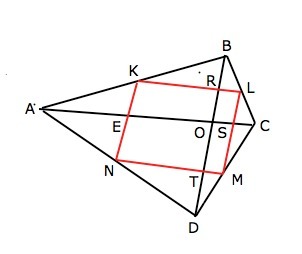 Проведем в данном четырехугольнике диагонали АС и BD. Точку пересечения обозначим О. Точку пересечения KN и АС обозначим Е, LM и АС – S, KL и BD – R, MN и BD – T.