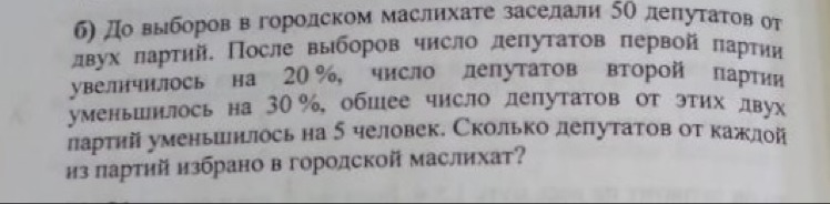 Пусть до выборов было х депутатов от перыой партии и 50 - х - от второй. После выборов в первой партии стало 1,2х депутатов, а во второй - 0,7(50 - х). Общее число депутатов после выборов, 1,2х + 0,7(50 - х), стало меньше общего числа депутатов до выборов на 5, т.е. стало 50 - 5 = 45. Имеем уравнение 1,2х + 0,7(50 - х) = 45.