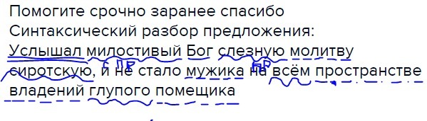 Услышал (сказуемое, выражено глаголом) милостивый(определение, выражено прилагательным) Бог (подлежащее, выражено существительным) слезную(определение, выражено прилагательным) молитву (дополнение, выражено существительным) сиротскую(определение, выражено прилагательным) , и не стало (сказуемое, выражено глаголом) мужика(дополнение, выражено существительным) на всём (определение, выражено местоимением) пространстве(дополнение, выражено существительным) владений (дополнение, выражено существительным)глупого(определение, выражено прилагательным) помещика (определение, выражено существительным).