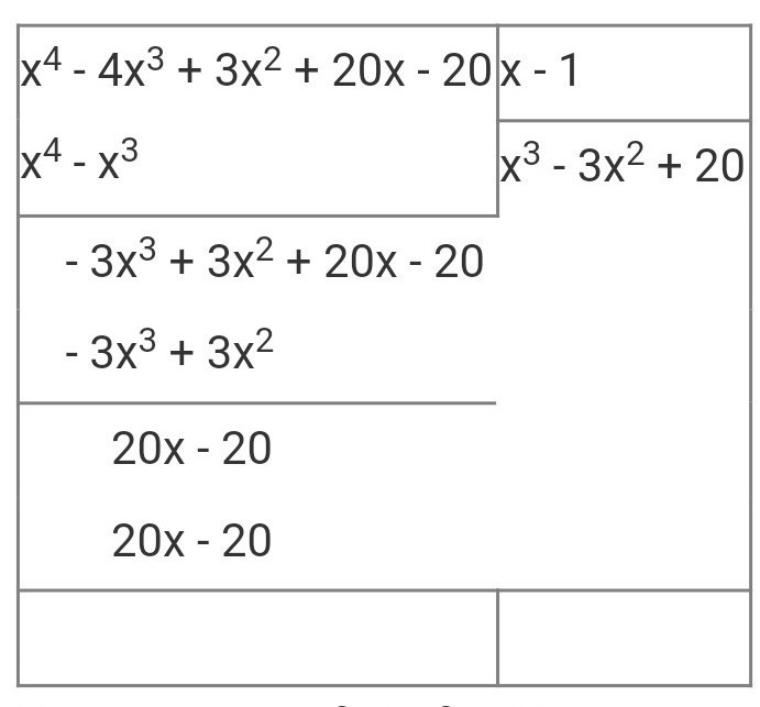 (x⁴-4x³+3x²+20x-20) на (x-1) получаем x³-3x²+20