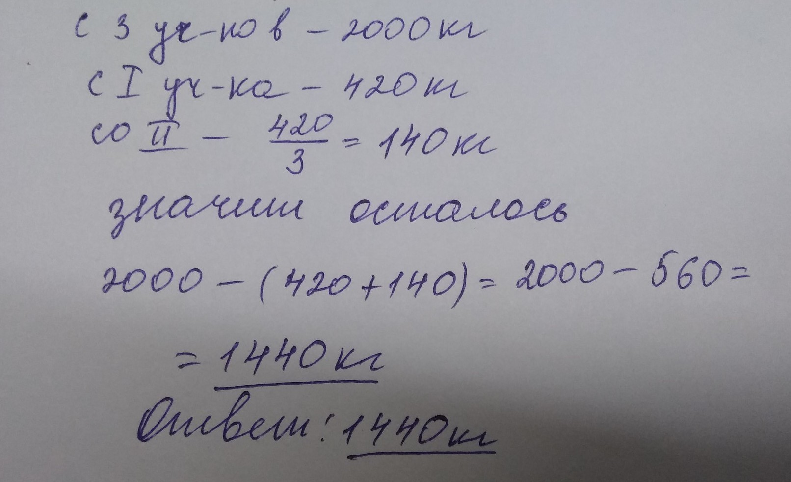 2) 2000 - (420 + 140) = 2000 - 560 = 1440 (кг) -- собрали с третьего участка