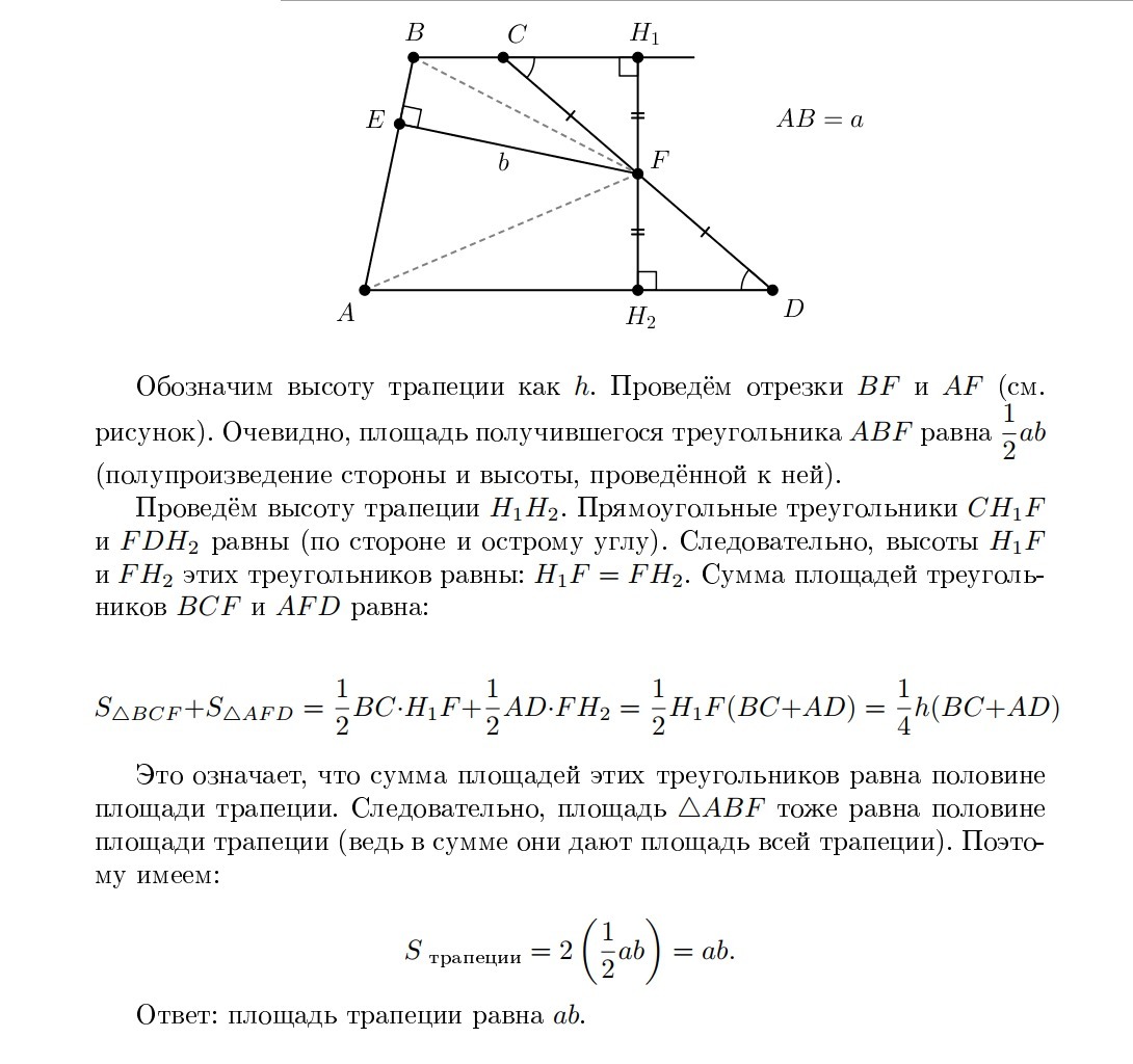 Длина боковой стороны трапеции равняеться a, а расстояние от неё до середины противоположной стороны равняеться b. Найти площадь трапеции.