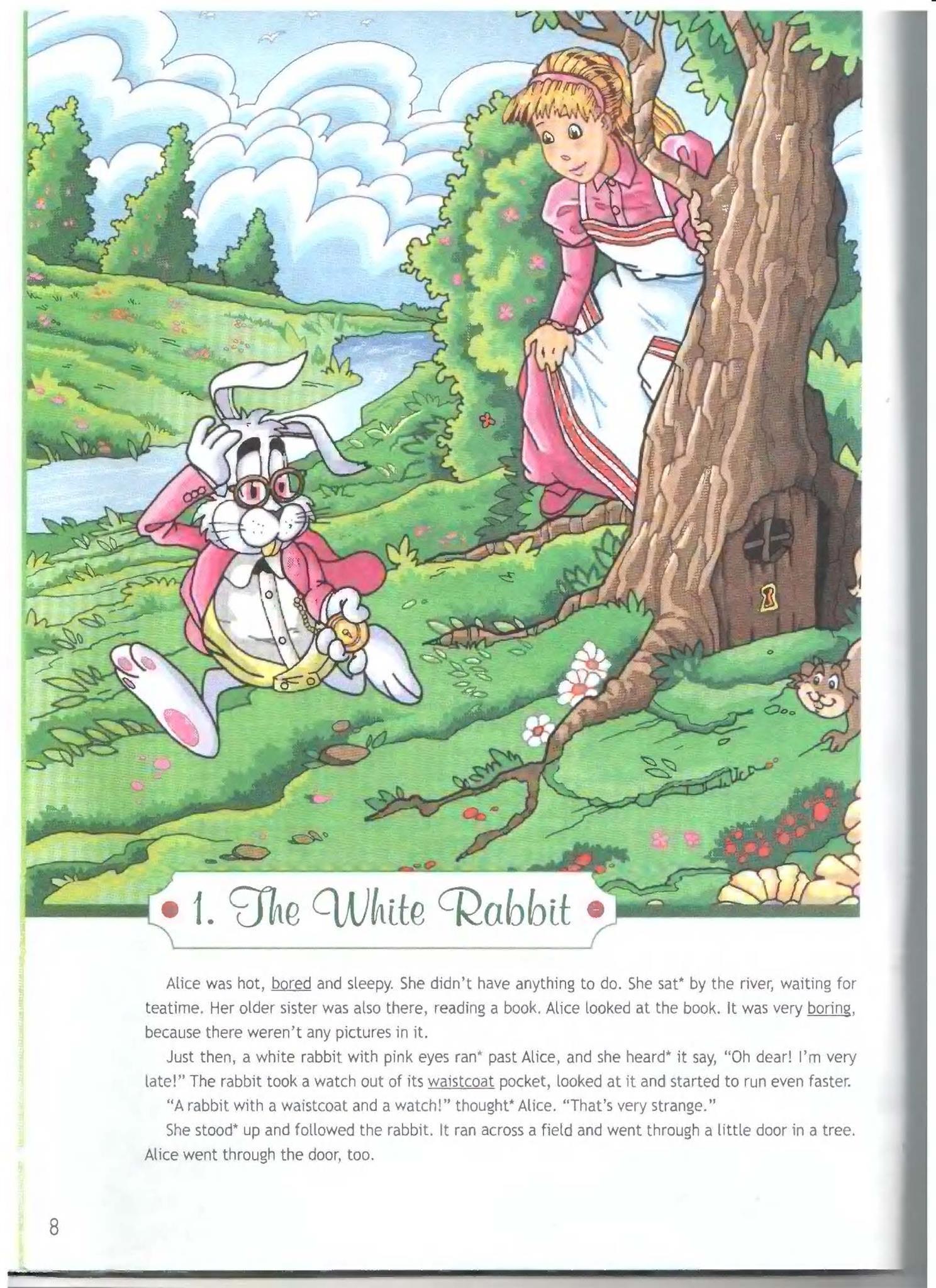 Элис было жарко, скучно и сонливо. Ей нечего было делать. Она присела около реки, ожидая время чаепития. Ее старшая сестра тоже была там, читала книгу. Эли посмотрела в книгу. Она была очень скучной потому что там не было никаких картинок.