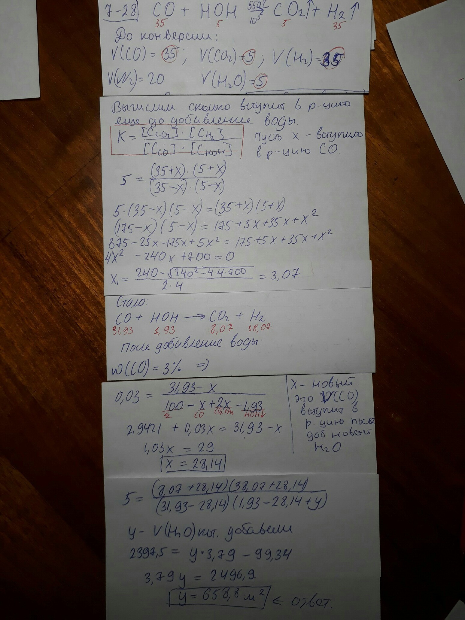 Оксид углерода (II) можно превратить в оксид углерода (IV) под действием водяных паров при температуре 550 °С и давлении 10 Н/м . В этих условиях константа равновесия равна 5. Вычислите, какое количество воды нужно прибавить к 100 газовой смеси состава 35% СО, 5% O2, 35% H2, 20% N2 и 5% H2O (в % по объему), чтобы после конверсии содержание СО в осушенном газе составляло 3%.