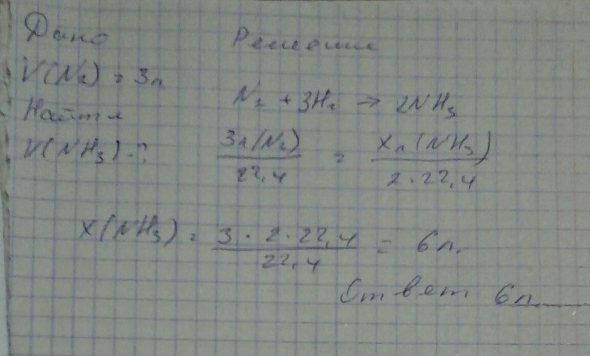 Определите объем аммониака,который образуется при взаимодействии 3 объемов азота с достаточным количеством водорода.