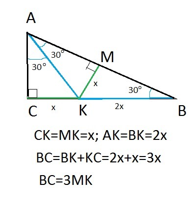 Δ AKM = Δ BKM (AK=KB, MK - общий катет). значит ∠ ВАК=∠АВК=30°