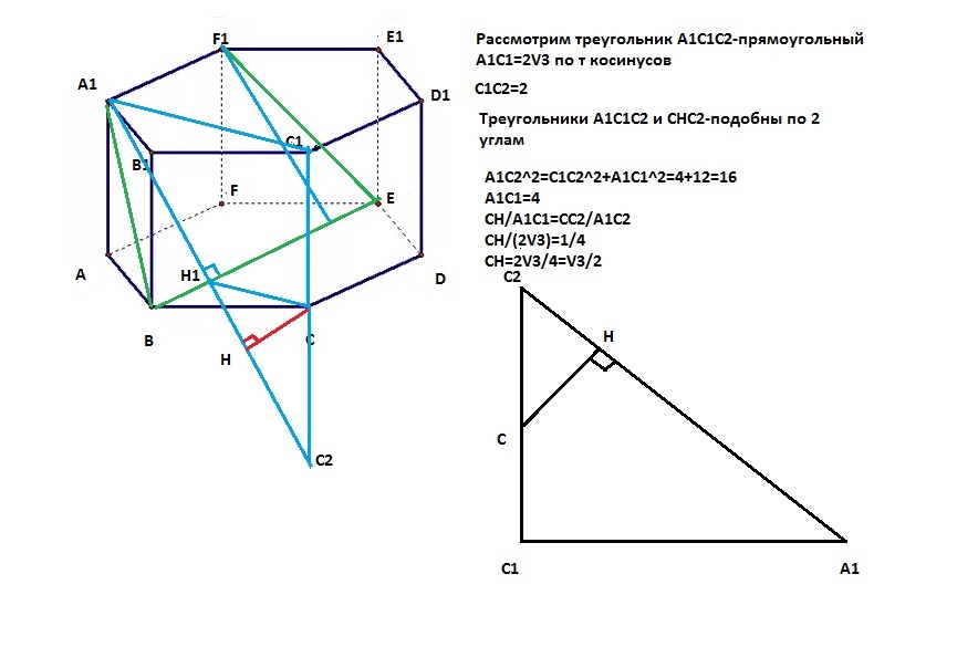 В правильной шестиугольной призме ABCDEFA1B1C1D1E1F1 сторона основания равна 2, а высота 1 Найдите расстояние от точки C до плоскости BEF1 (ответ: √3/2)