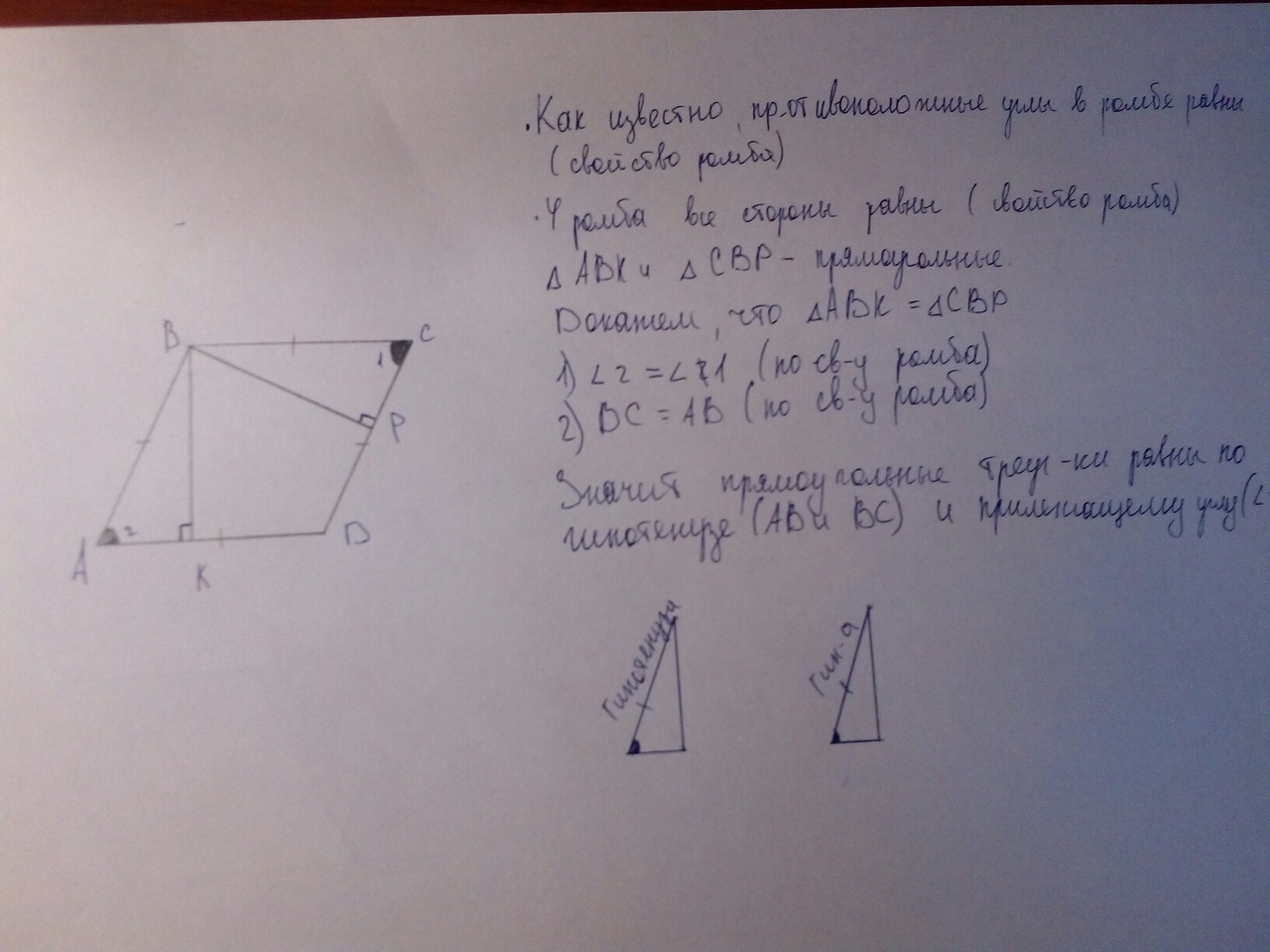в ромбе ABCD из вершины тупого угла B к стороне AD проведена высота BK и к стороне CD-высота BP.Докажите равенство треугольников ABK и CBP.Пж дайте рисунок