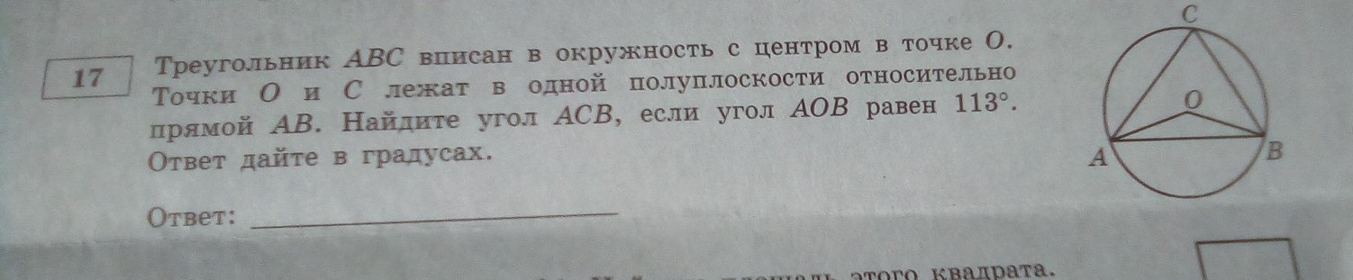 угол АОВ и угол АСВ опираются на одну и ту же дугу АВ только АОВ-центральный угол а АСВ -вписанный))) вписанный угол в два раза меньше центрального...угол АСВ=113/2=56,5