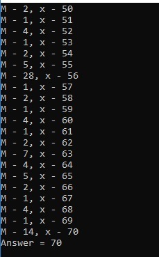 Написал программу, которая пробегает алгоритм и ищет верный ответ, собственно говоря результат: 70.