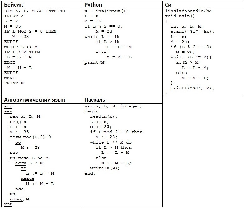 Ниже на пяти языках программирования записан алгоритм. Получив на вход число x, этот алгоритм печатает число M. Известно, что x > 50. Укажите наименьшее такое (т.е. большее 50) число x, при вводе которого алгоритм печатает 14.