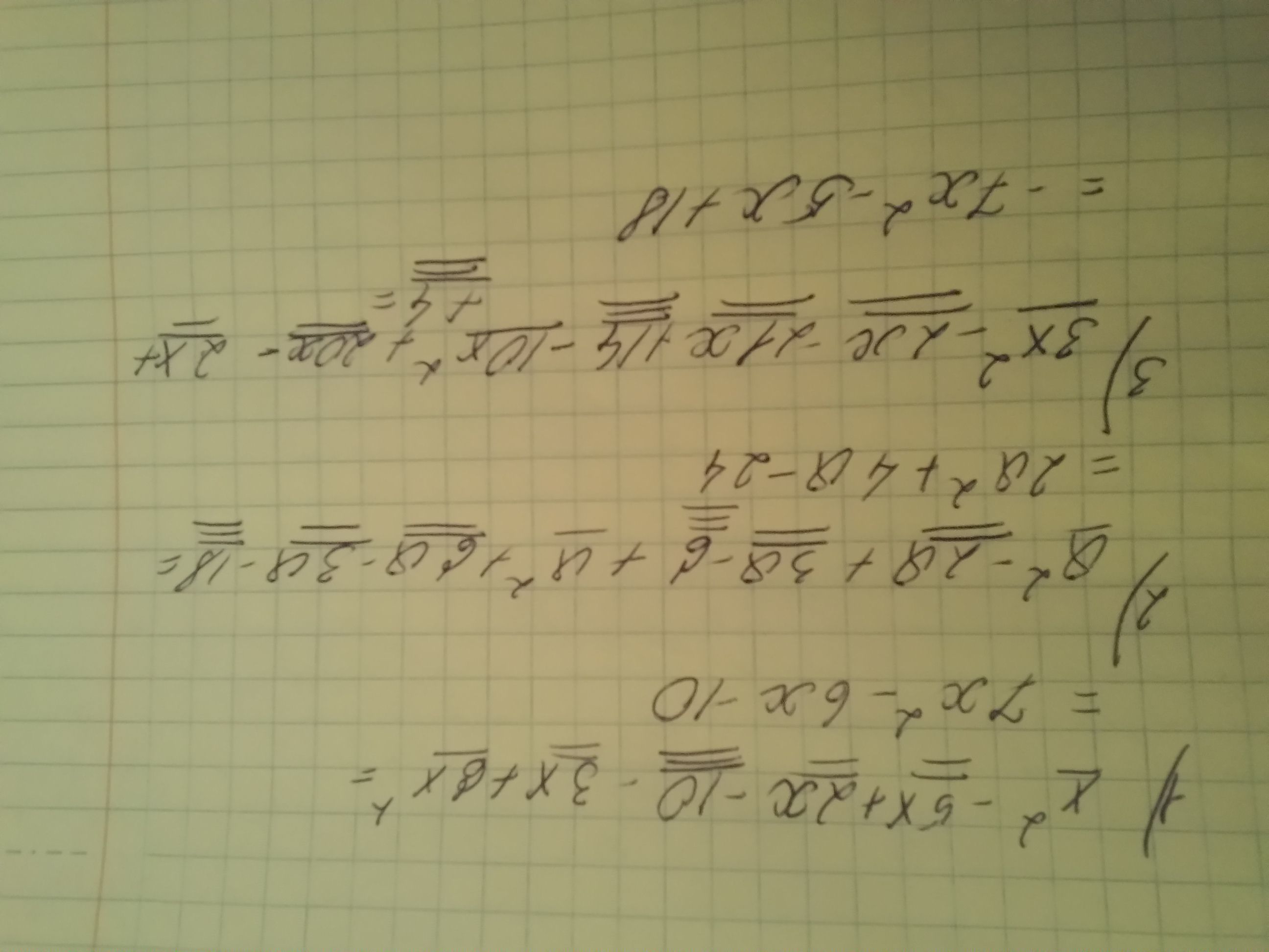 3) (x - 7)(3x - 2) - (5x + 1)(2x - 4)= 3x² - 21x - 2x + 14 - (10x² + 2x - 20x - 4) = 3x² - 23x + 14 - 10x² + 18x + 4 = -7x² - 5x + 18