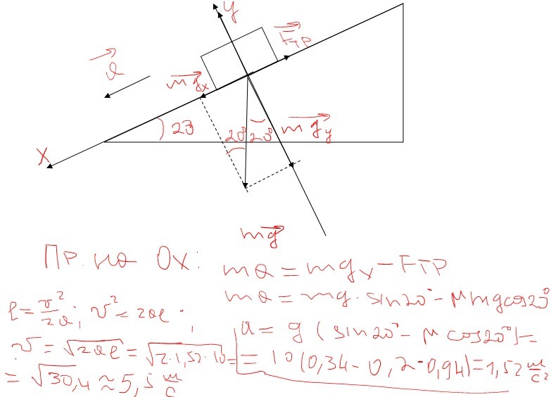 Якої швидкості набудуть санки наприкінці спуску с гори заввишки 10м, кут нахилу якої до горизонту становить 20. Коефіцієнт тертя між санками і снігом дорівнює 0,2. Швидкість санок на початку схилу дорівнює 0м/с.