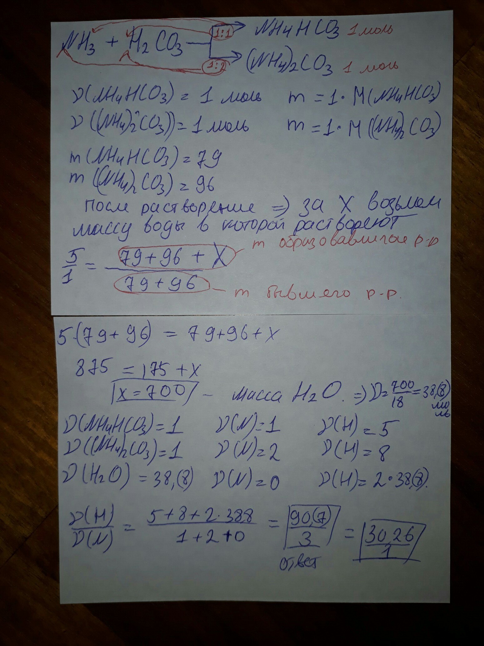 Две соли образованные аммиаком и угольной кислотой ,смешали в молярном соотношении 1:1,а затем растворили в воде при температуре 0грдС .масса раствора оказалась больше массы исходной смеси солей в 5 раз.Вычислите отношение числа атомов водорода к числу атомов азота.(прошу не просто ответа,а полного решения )