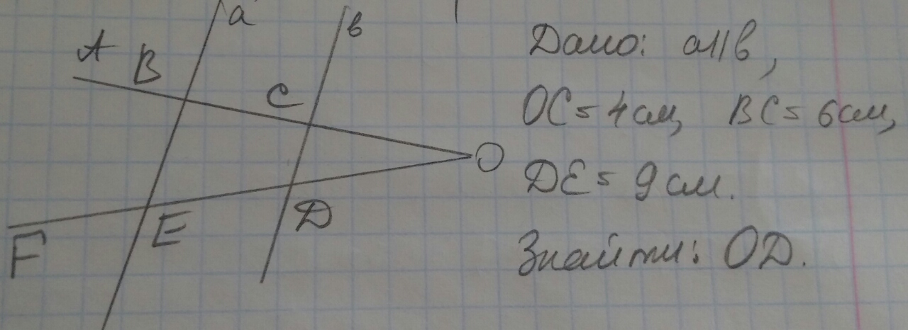 по теореме Фалеса BC/ED=OC/OD 6/9=4/OD OD=6 см