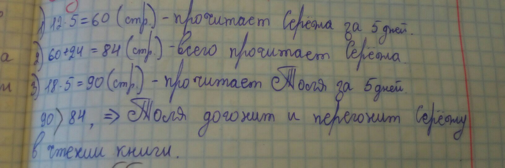 Толя начал читать книгу когда Сережа уже прочитал 24 страницы такой же книги догонит ли дарить Серёжу через 5 дней если он читает в день 18 страниц, а Сережа 12