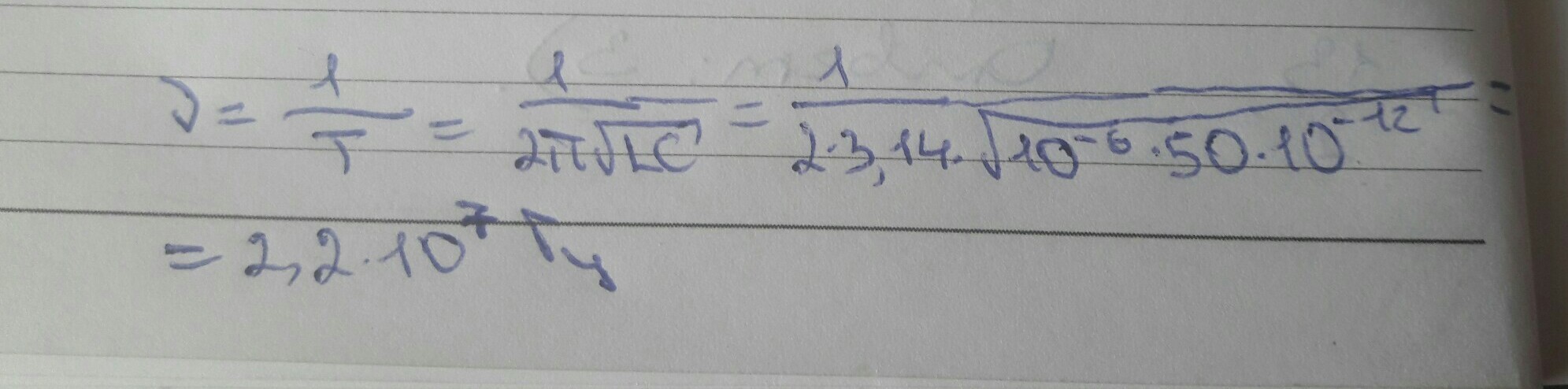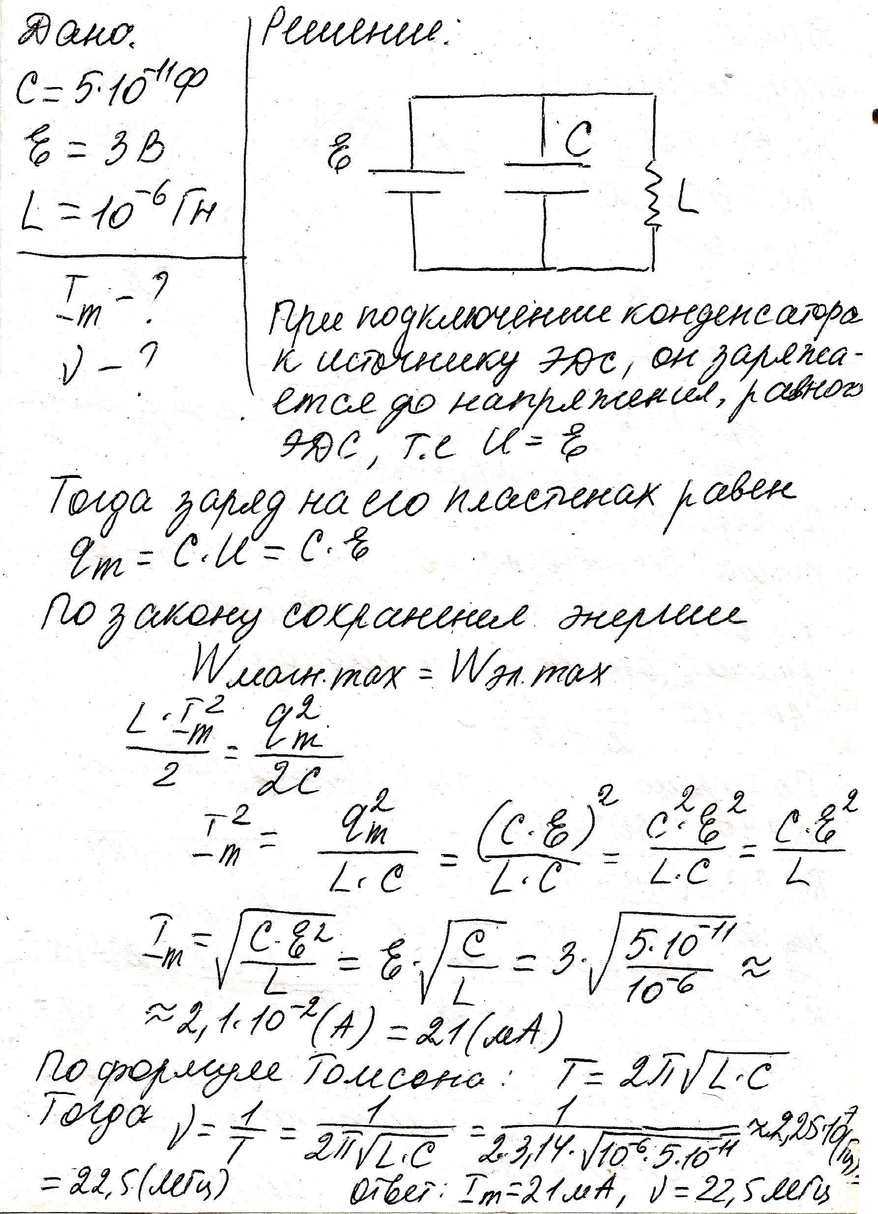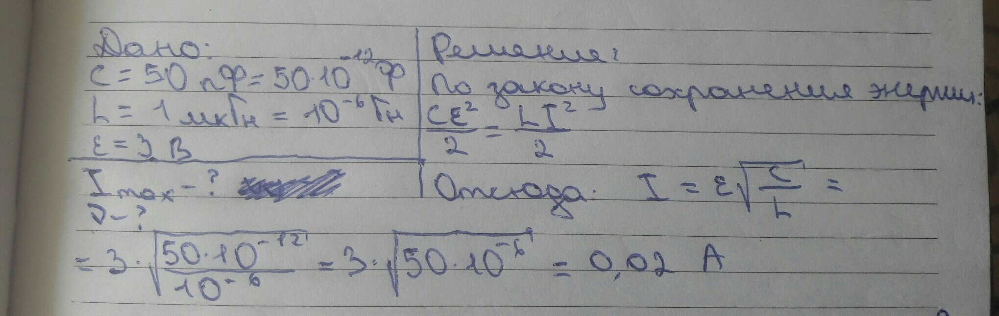 Конденсатор емкостью С = 50 пФ подключили к источнику тока с ЭДС, равной ε= 3 В, а затем к катушке с индуктивностью L = 1 мкГн. Определить максимальное значение силы тока и частоту колебаний, возникающих в контуре.