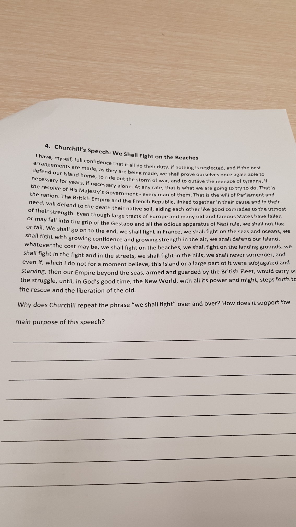 why does churchill repeat the phrace "we shall fight" over and over? How foes it support the main purpose of this speech?