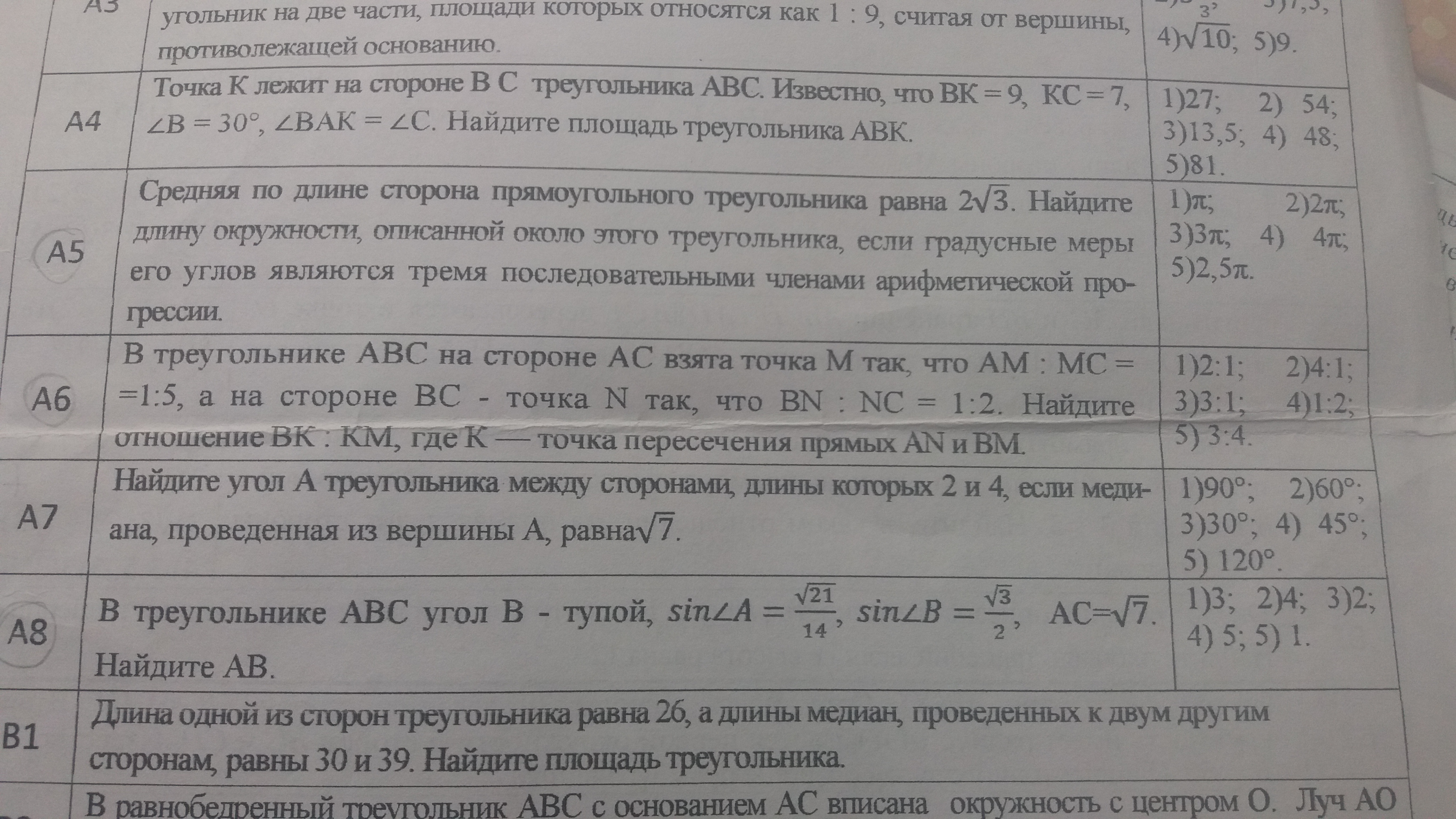 A5 Нарисуем этот прямоугольный треугольник. Один из углов, составляющих прогрессию, равен 90. Очевидно это самый большой угол. Напротив средней по длине стороны (больший катет) лежит второй по величине угол из прогрессии, обозначим как Оставшийся угол -