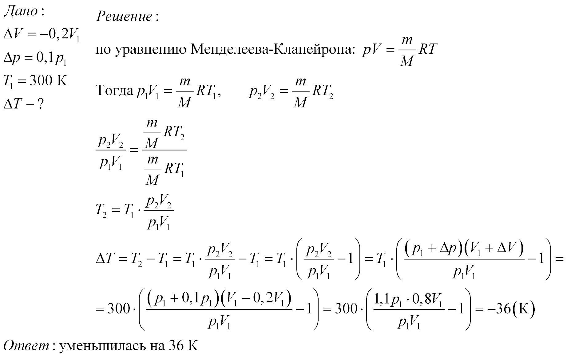 Объём идеального газа уменьшился на 20%, давление повысилось при этом на 10%. Насколько изменилась температура газа, если его начальная температура была равна 300 К?