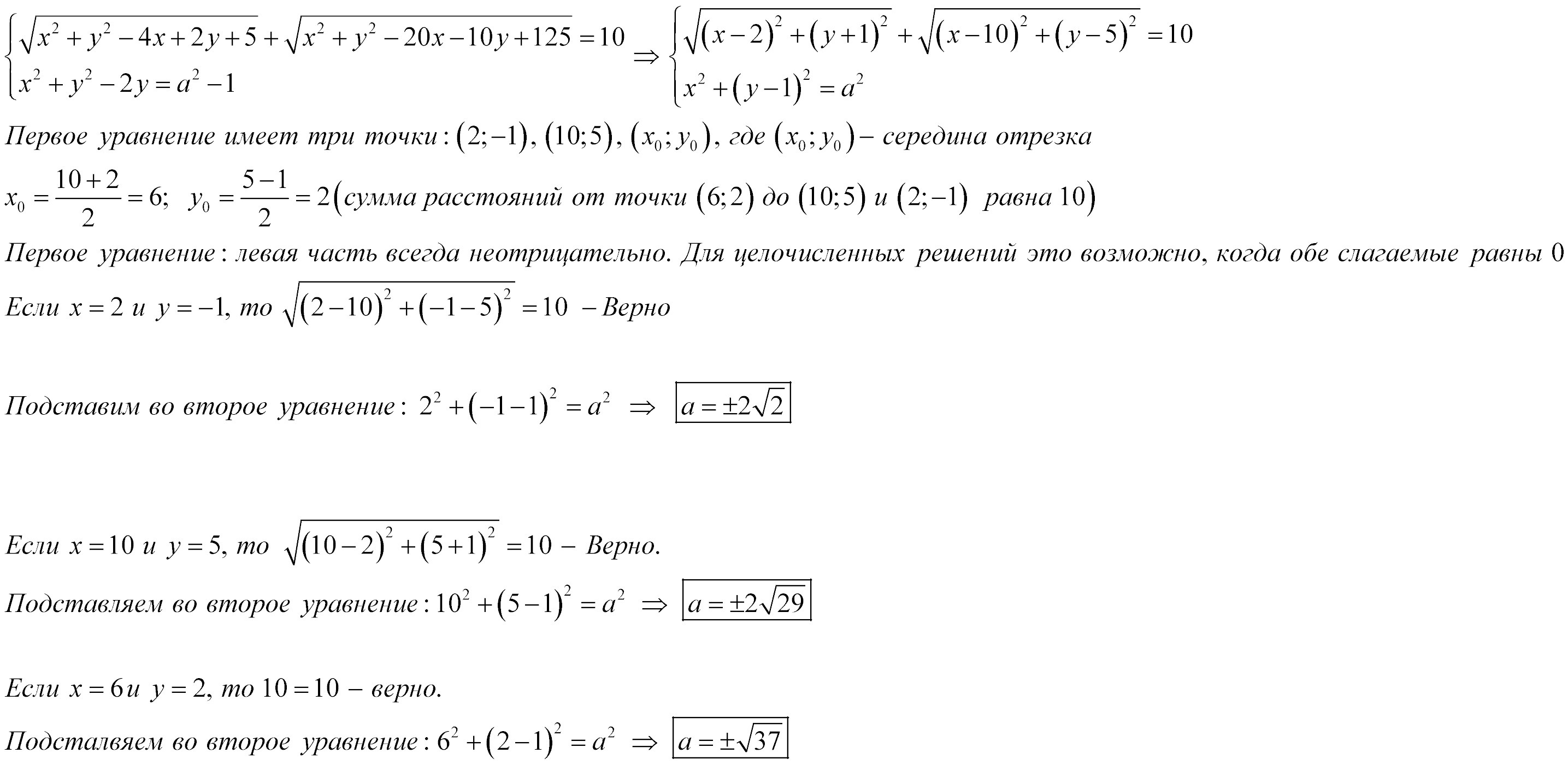 первое уравнение системы : корень из(x^2+y^2-4x+2y+5)+ корень из(x^2+y^2-20x-10y+125)=10