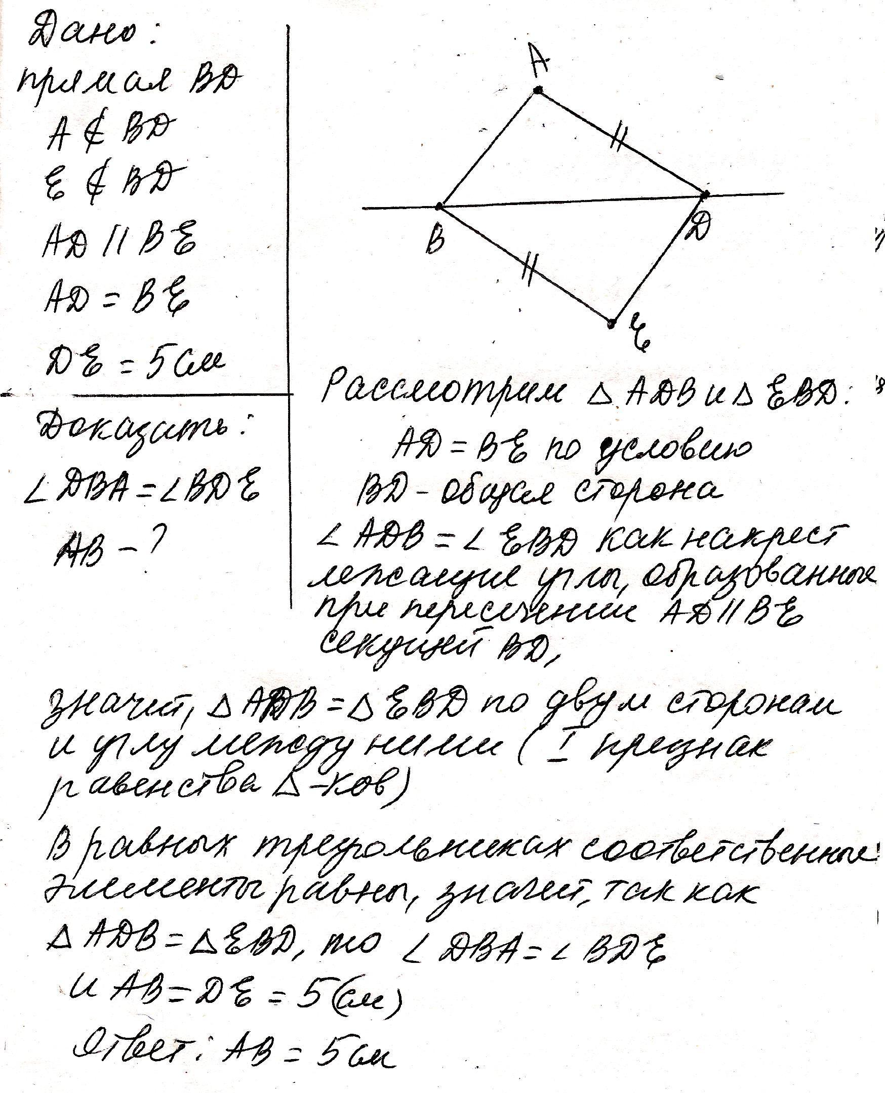 Точки А и E лежат по разные стороны от прямой BD,AD// BE,AD=BE. Докажите, что угол DBA=углу BDE и найдите AB, если DE=5 см.
