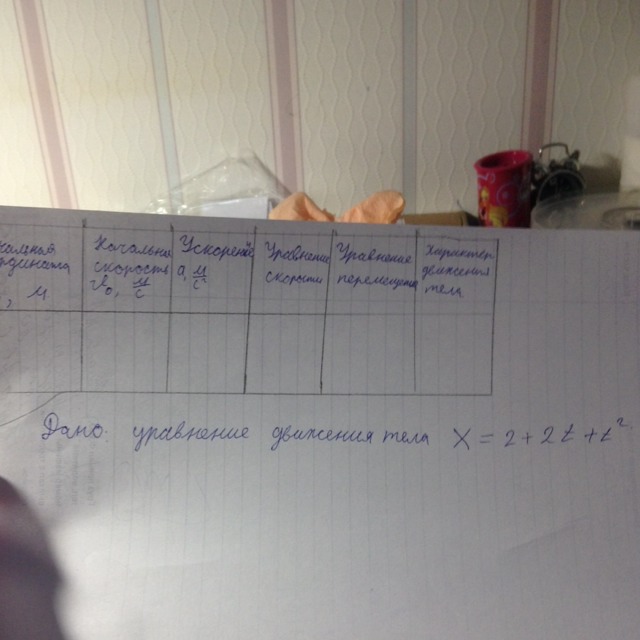Пожалуйста помогите. Очень важно. 1. Начальная координата. 2. Начальная скорость. 3. Ускорение 4. Уравнение скорости. 5. Уравнение перемещения. 6. Характер движения тела. Дано уравнение движения тела x=2+2t+t(квадрат).