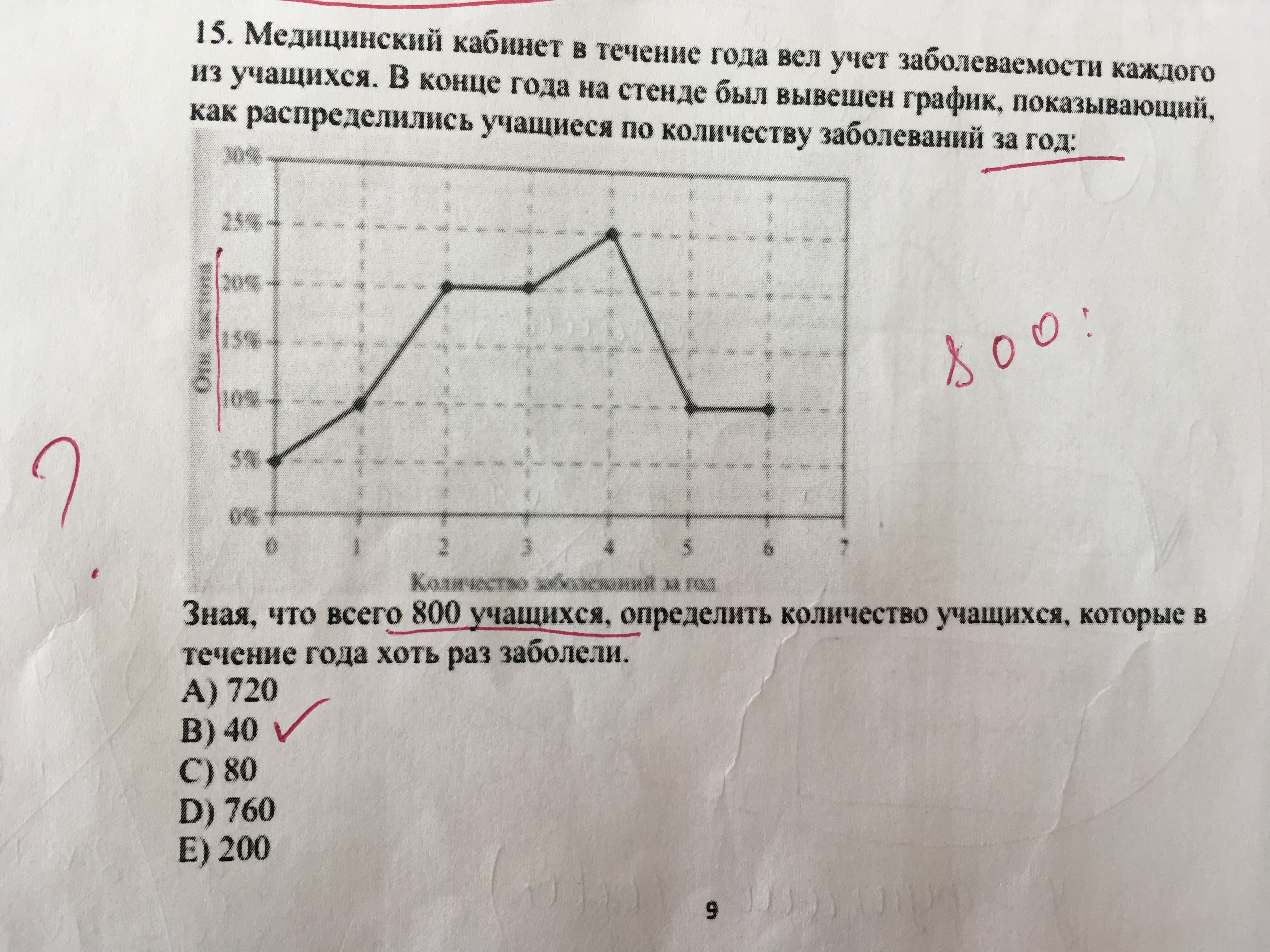 Медицинский кабинет в течении года вёл учёт заболеваемости каждого из учащихся. В конце года на стенде был вывешан график, показывающий как распределялись учащиеся по количеству заболеваний в год. Зная что всего 800 учащихся, определите количество учащихся, которые в течении года хоть раз заболели.