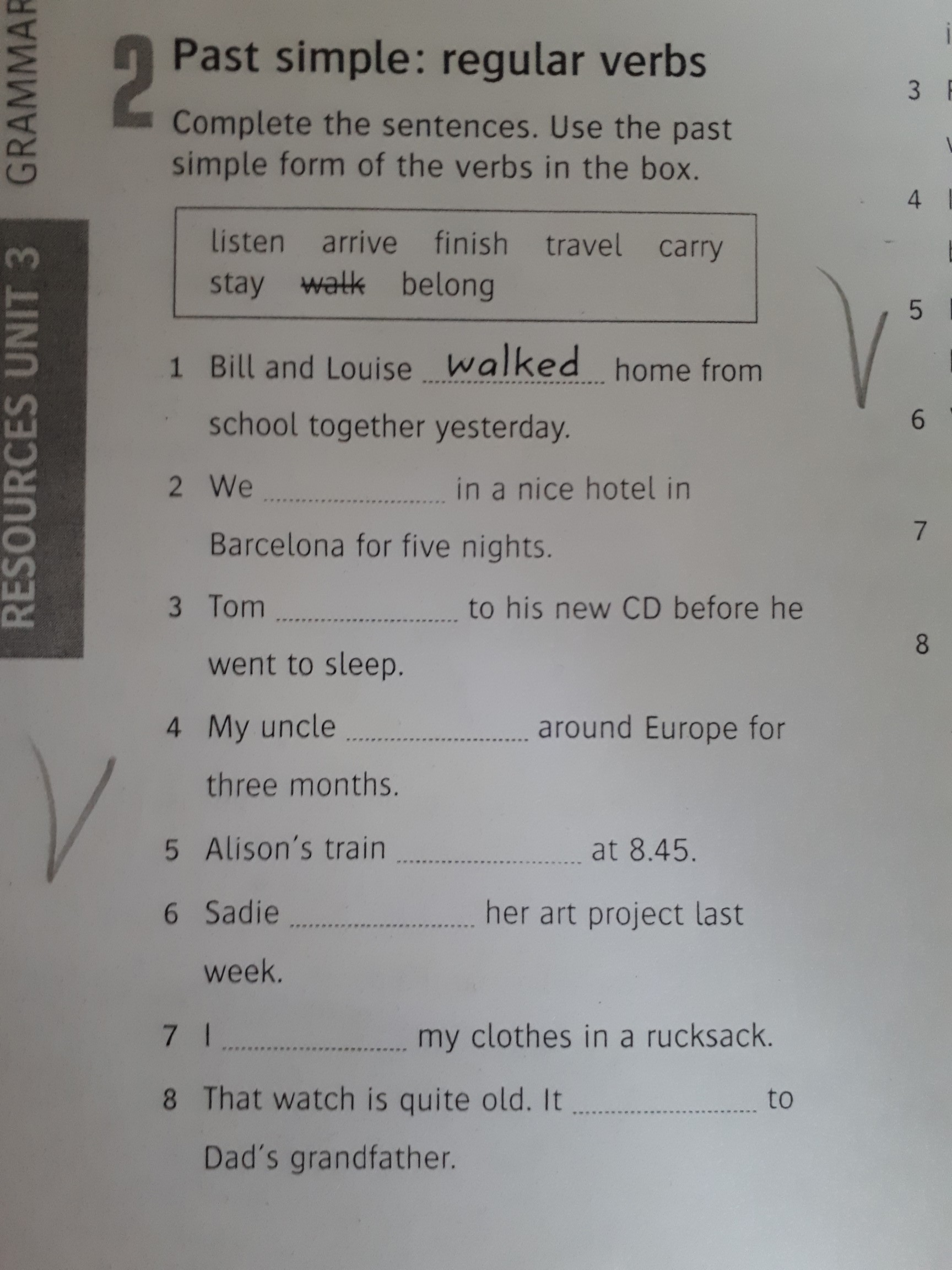 Walked, stayed, listened, travelled, arrived, finished, carried, belonged.