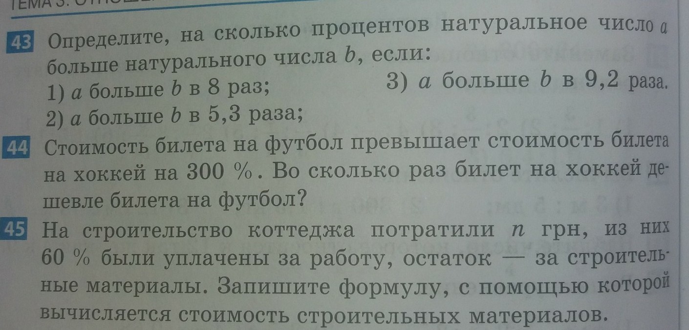 43) Смотри, а больше б в 8 раз, а если возьмем б за 100%, то а будет 800% (в 8 раз больше). Чтобы узнать, на сколько а больше б, нужно из а вычесть б: будет 700%. Пункт 2 и 3 аналогично.