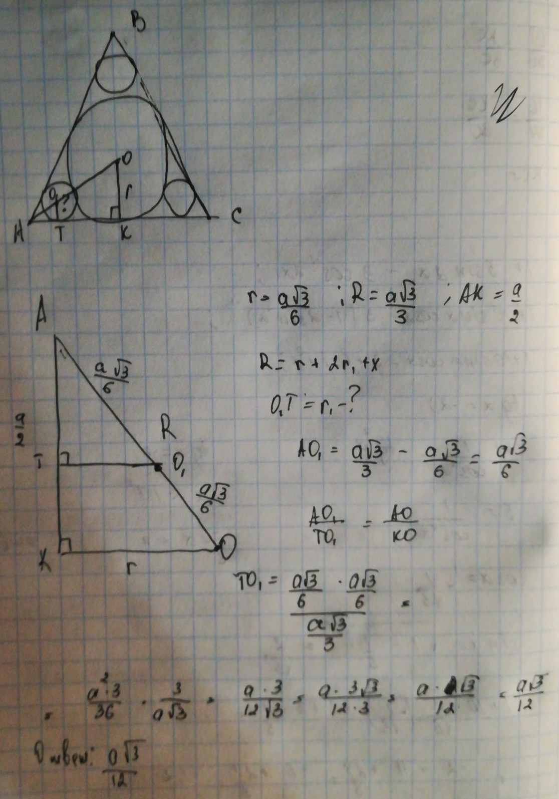 в правильный треугольник со стороной "а" вписана окружность три маленьких окружности касаются этой окружности и двух сторон треугольника найти радиусы маленьких окружностей