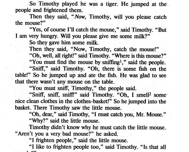 Однажды здесь были люди которые имели маленькую мышь в их доме. В один день они сказали : "Мы заведем кота. Кот поймает мышь". Так что они завели кота. Кота назвали Тимоти. Вся правда в том что Тимоти боялся мышки. Но люди не знали об этом. Они сказали "теперь, Тимоти, поймаешь ли мышь, пожалуйста?". Видишь, коты должны ловить мышей. Так что Тимоти сказал: "Я поймаю мышь. Но хочу немного поиграть. Могу ли я немного поиграть?