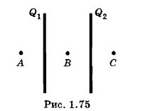 Две металлические пластины, площадью S каждая, несут положительные заряды Q1 и Q2. Расстояние между пластинами много меньше их линейных размеров. Найдите напряженность в точках A, В, С (рисунок)