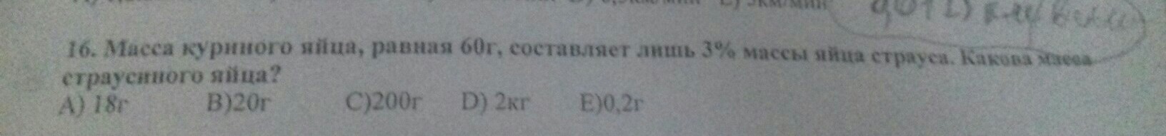 20 × 100% = 2000 г = 2 кг (масса страусиного яйца)