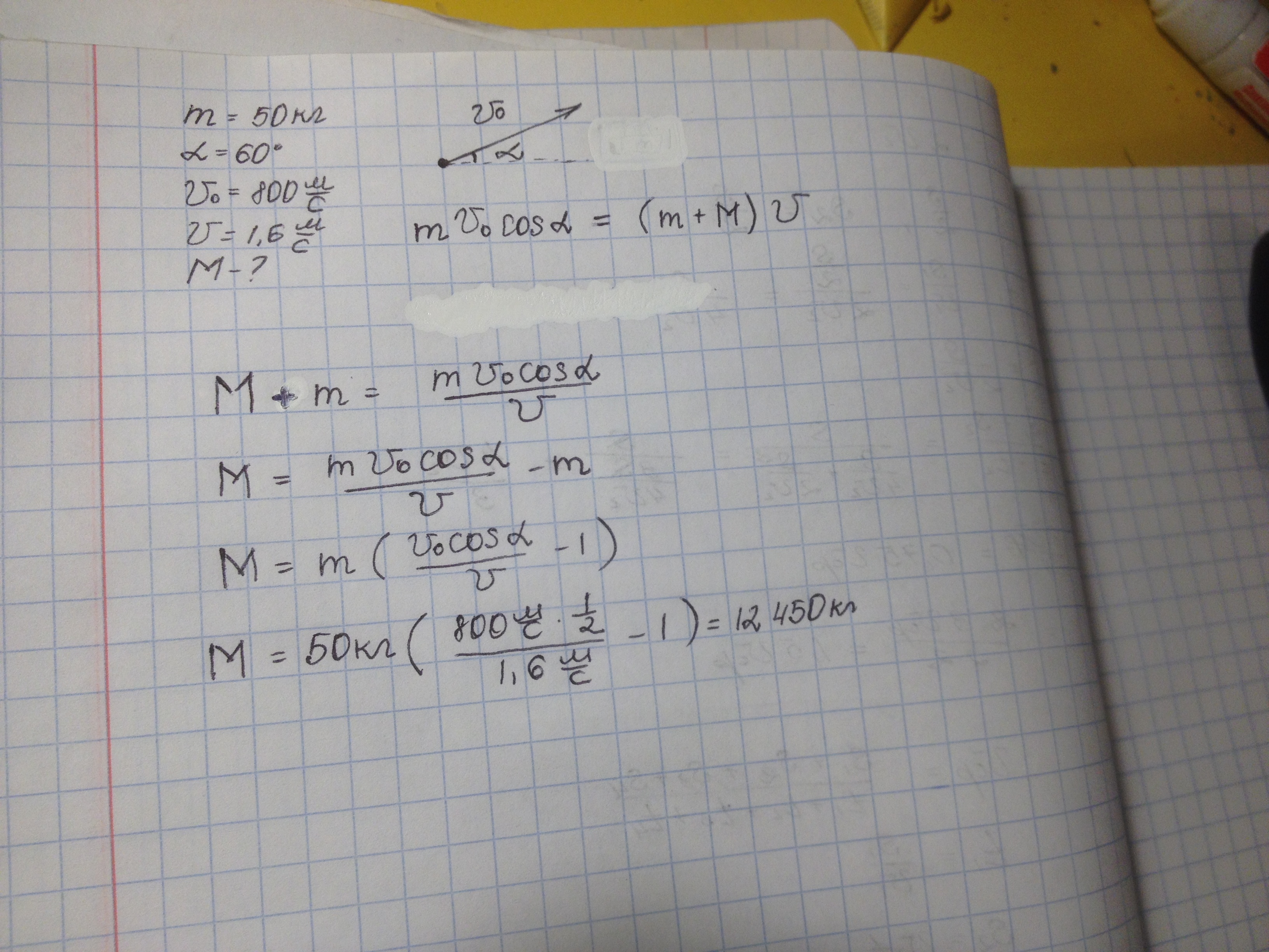 Cнаряд масою 50 кг, який летить під кутом 60 до горізонту зі швидкістю 800м/c, внаслідок чого платформа починає рухатися зі швидкістб 1,6 м/c. Визначте масу платформи