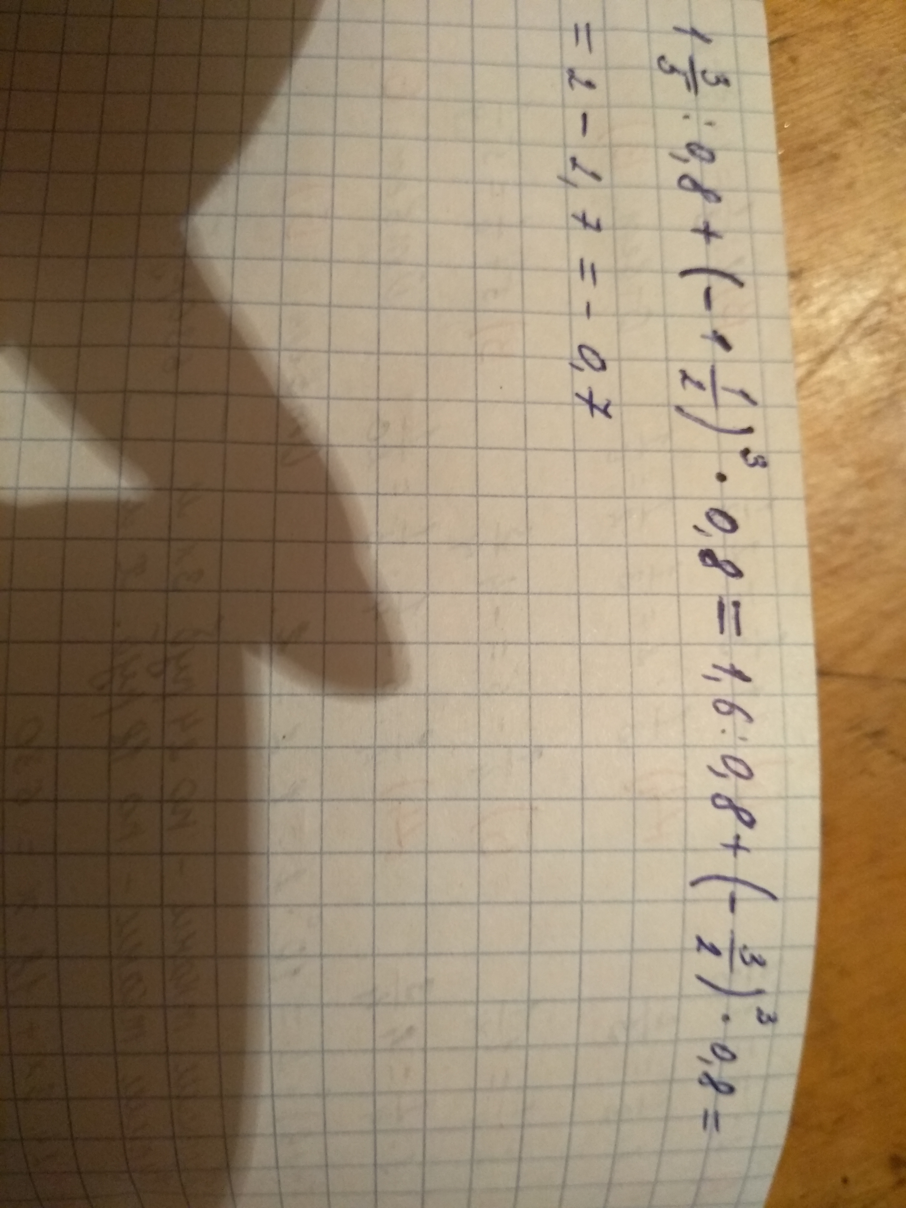 1 3/5:0.8+(-1 1/2)^3*0,8 = 8/5 : 8/10 + (-3/2)^3* 8/10 = 2 - 9/8 * 8/10 = 2 - 9/10 = 2 - 0,9 = 1,1