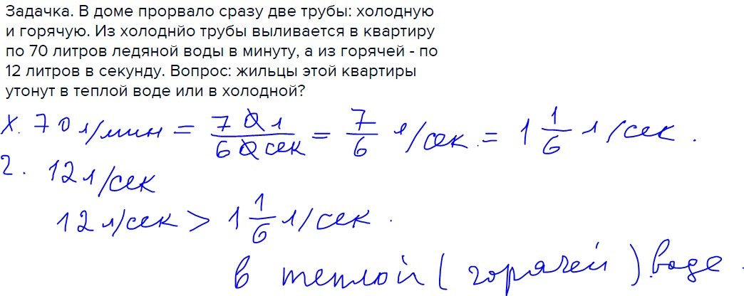 Зaдaчкa. В доме прорвало сразу две трубы: холодную и горячую. Из холоднйо трубы выливается в квартиру по 70 литров ледяной воды в минуту, а из горячей - по 12 литров в секунду. Вопрос: жильцы этой квартиры утонут в теплой воде или в холодной?