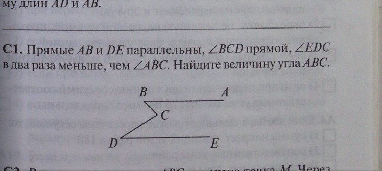 Прямые A и B параллельны,угол BCD прямой,угол EDC в два раза меньше,чем угол ABC.Найдите величину угла ABC.