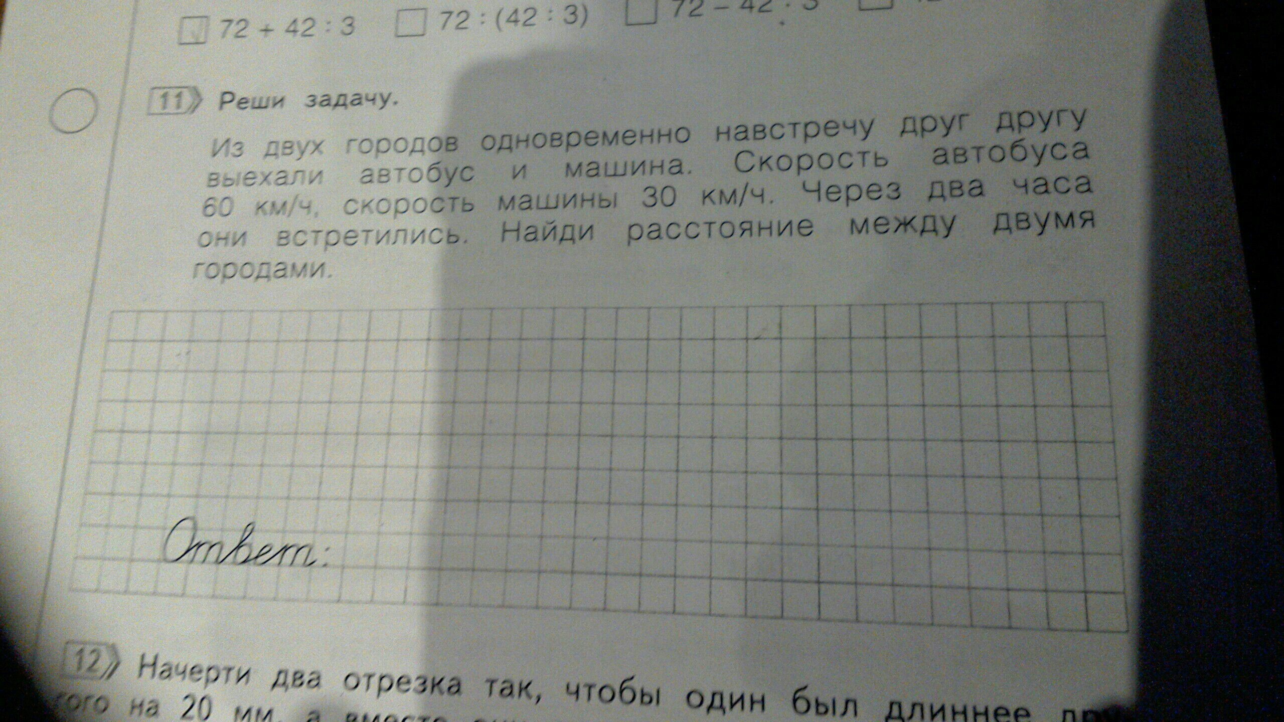 реши задачу Из двух городов Одновременно навстречу друг другу выехали автобус и машина скорость автобуса 60 км ч скорость машины 30 км ч через 2 часа не встретились найди расстояние между городами