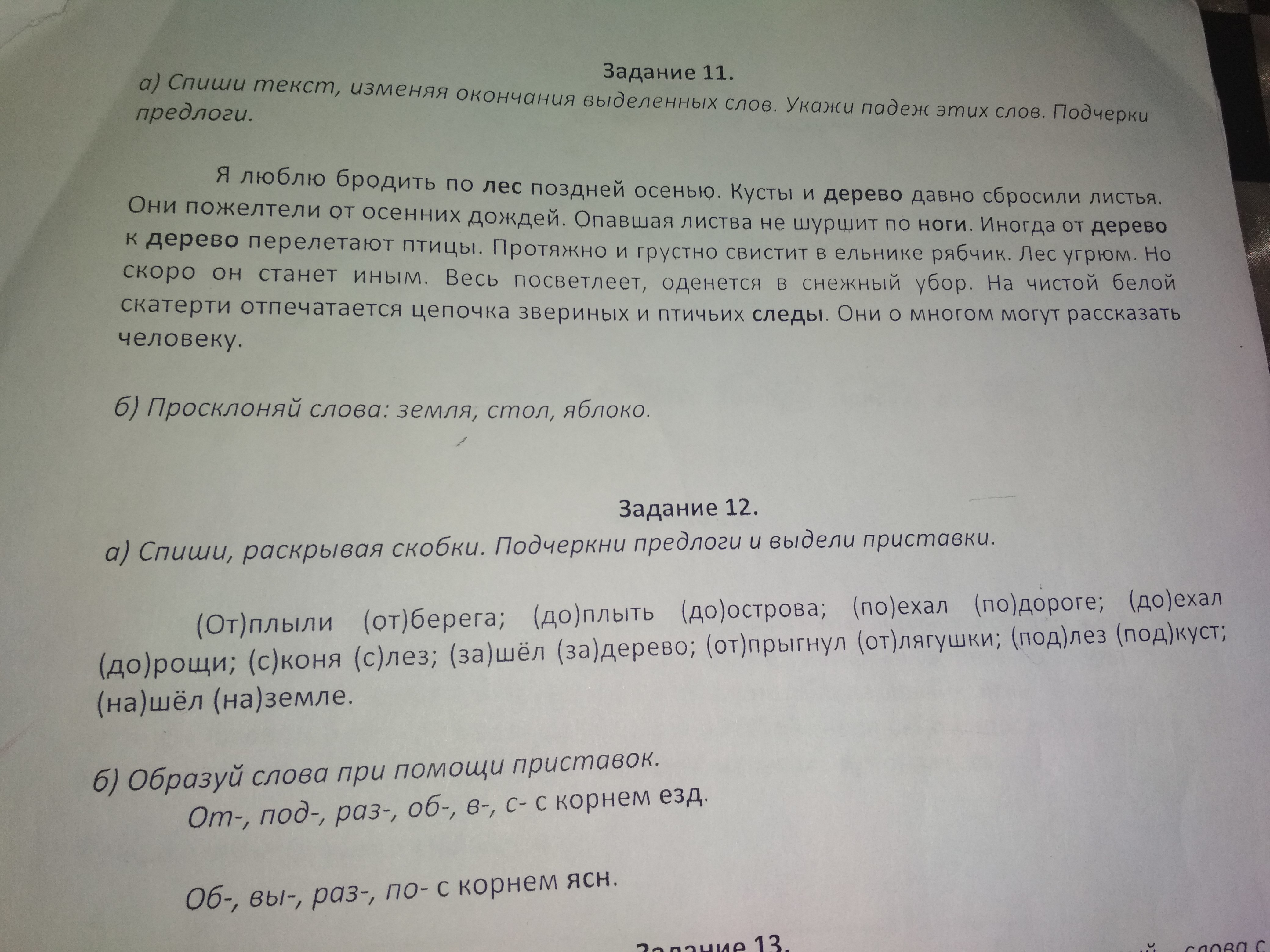 Я люблю бродить по(предлог) лесу поздней осенью. Кусты и деревья давно отбросили свои листья. Они пожелтели от(предлог) осенних дождей. Опавшая листва не шуршит по(предлог) ногам. Иногда от(предлог) дерева к(предлог) дереву перелетают птицы. Протяжно и грустно свистит в(предлог) ельнике рябчик. Лес угрюм. Но скоро он станет иным. Весь посветлеет, оденется в снежный убор. На чистой белой скатерти отпечатается цепочка звериных и птичьих следов. Они о(предлог) многом могут рассказать человеку.