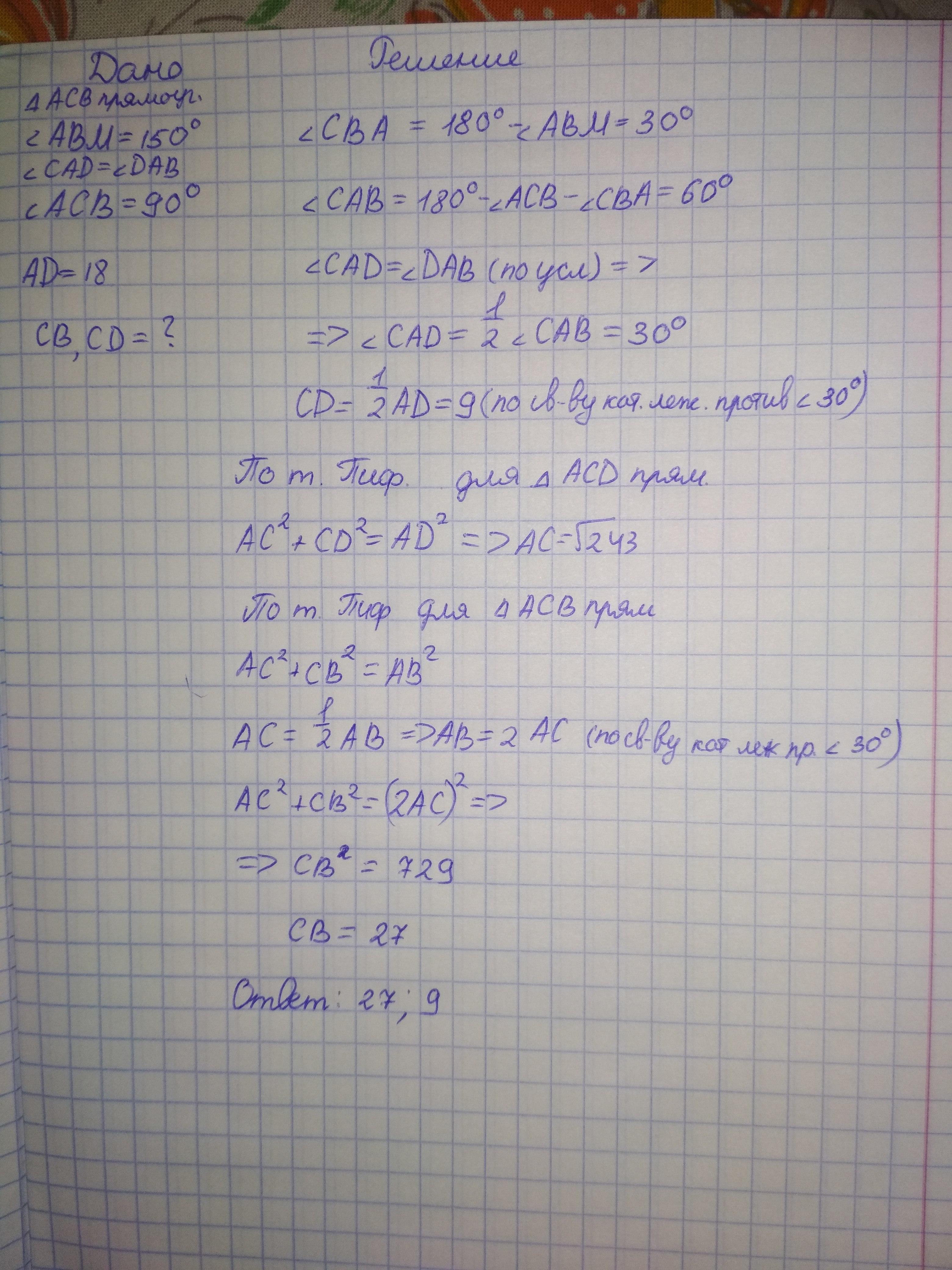 С=90, ДВА=30, значит САВ=60, АД-биссекриса. Значит АВД равнобедренный, с основанием АВ, значит ДА=ДВ=18...